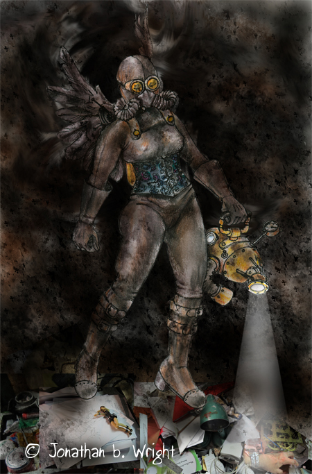 This image came about through my own personl interest in Victorian imagery, Steampunk, and a pin off of one of my favorite prints, "Love Comes... strings attached." It is a post-apocalypse Steampunk Hazmat suited charcter.