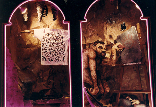 I worked there for 2 years, and it was great. I had all sorts of creative freedom doing a window a day, rotating through the 7 windows of various sizes and orientations. I also did interior merchandising and handyman stuff. I could tell a window was successful if the featured merchandise sold out quickly.... then I had to immediately create a new one. MOST of my displays featured some sort of airbrushed and cut out figure, this followed the lead of my predecessor. One of my first windows was a bathroom scene to sell some of the many bath products available. I painted a woman in a bathtub, cut it out and laminated iridescent film over the bubbles, and a chrome foil on the faucet. I made her a talk balloon that read "excuse me! I'm trying to take a bath!" I even brought in a real porcelain toilet to complete the scene. Sadly, Cynthia & Elaine (the owners) decided to retire and Middle Earth was closed. |